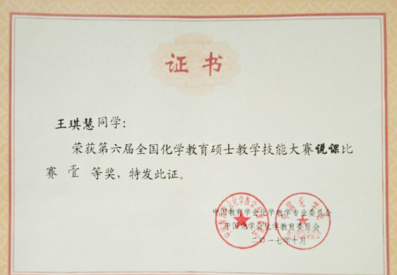 此次决赛共分4个小组进行,参赛选手要根据初赛教学设计在15分钟内完成比赛。第一部分为现场说课,主要展示“教学设计的基本思路”和“教学活动的主要环节”。第二部分为播放10分钟以内微视频,主要展示“教学中的精彩片段”。比赛过程对化学教育硕士的教学素质提出了较高的要求,我校学子荣获佳绩体现出了我校在教育硕士培养方面的突出成绩。