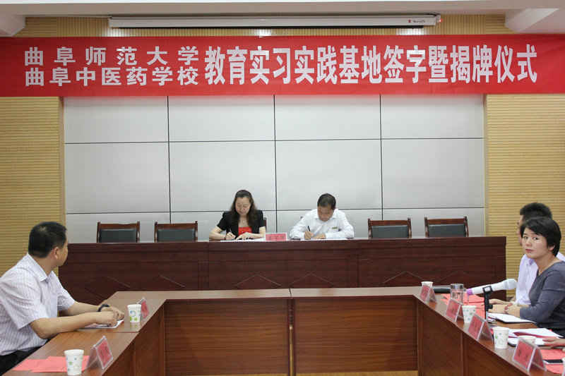 威澳门尼斯人院长曹莉与曲阜中医药学校校长孔令俭签署了教育实习基地协议,研究生工作部副部长刘敏和孔令俭签署了研究生教育实践基地协议,我校副校长扈庆学与曲阜市人大副主任段德柱共同为基地揭牌。