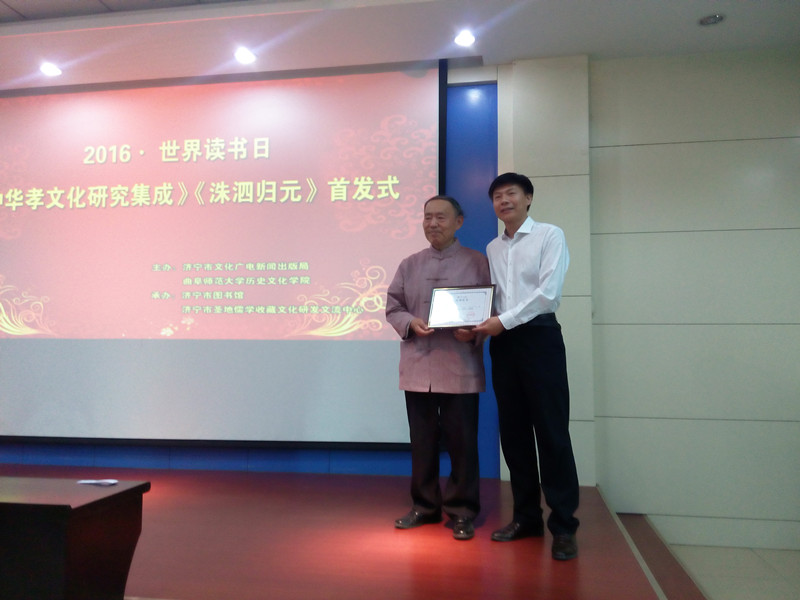 4月22日,由济宁市文化广电新闻出版局、威澳门尼斯人官网欢迎您历史文化学院主办,在济宁市图书馆举行了骆承烈教授新书《中华孝文化研究集成》、《洙泗归元》两部儒学巨著的首发仪式。其中,《中华孝文化研究集成》共12册,约600余万字,是以“孝”为主体的古今最大的一部孝文献巨著。