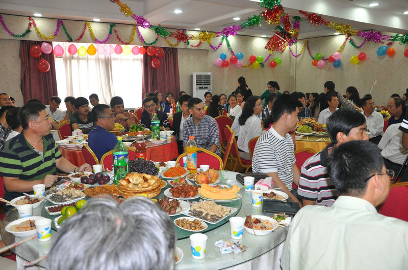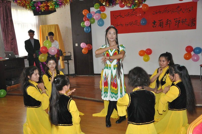 联欢会上,师生共同品尝着学校精心准备制作的丰盛菜肴,欣赏着同学们自排自演的精彩节目。欢庆活动丰富多彩,以歌舞表演为主,趣味游戏穿插其中。舞蹈“美丽的姑娘”、“萨玛舞”、“麦西来甫舞”等展现出独特民族艺术风采;歌曲《爱因为在心中》等唱出新疆学生对学校关怀教育的感激之情;“抢凳子大赛”令大家在活跃的气氛中感情升温。现场掌声连连,欢乐融融,充满着浓浓的节日气息。