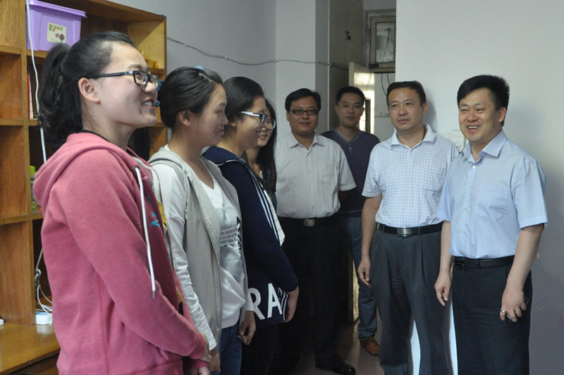 9月12日下午,校领导荆兆勋、戚万学、康淑敏在学生工作处、保卫处、校区管理办公室、校区学生工作办公室、后勤管理处等有关部门负责人陪同下,分别走访了两校区新生宿舍,看望慰问2015级新同学。