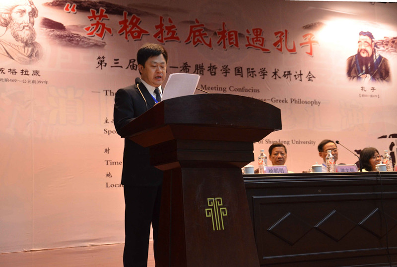 6月4日—6日,由我校历史文化学院和山东大学古希腊思想研究中心主办的 “苏格拉底相遇孔子”——第三届中国—希腊哲学国际学术研讨会在我校隆重召开。本次会议旨在加深中国文化和西方文化的交流与沟通,推进经济全球化背景下中西文化互相学习与借鉴。校长戚万学出席开幕式并致开幕辞。他代表学校向莅临会议的各位专家学者表示热烈欢迎,对本次国际学术研讨会的顺利举行表示祝贺。