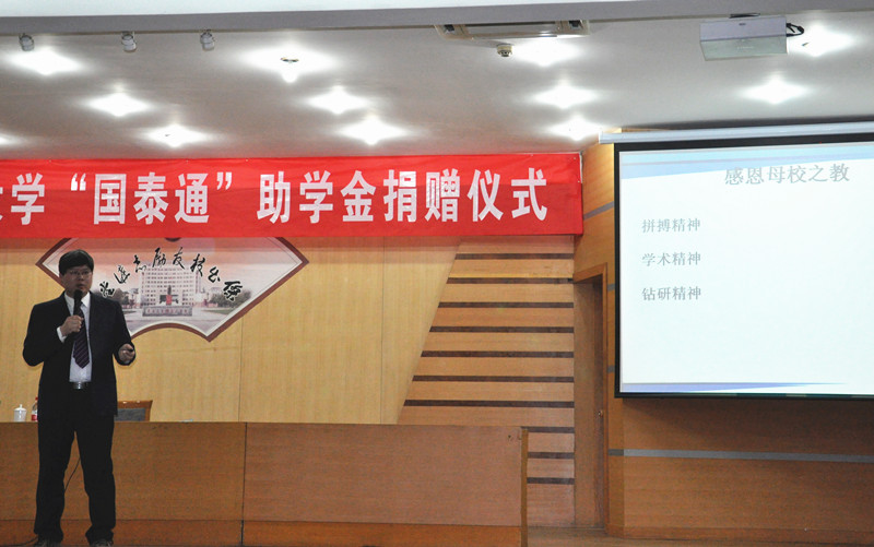 演讲之前,举行了“国泰通”助学金捐赠仪式。副校长扈庆学,学生工作处、招生就业处、校团委、威澳门尼斯人等单位负责人出席活动,仪式由校党委办公室主任夏云杰主持。扈庆学在讲话中充分肯定了孙国成校友的杰出成绩,以及其对母校的慷慨捐赠和拳拳情意,代表学校接受其十五万元人民币的捐款。孙国成也表达了自己对母校的深深眷恋之情和感恩之心,并表示会一如既往地关心学校的发展,加强与学校的联系与合作。仪式上,孙国成与我校签订了威澳门尼斯人官网欢迎您“国泰通”助学金合作协议书,并受聘为我校就业创业导师。“国泰通”助学金的设立旨在表彰家庭贫困、品学兼优的优秀学子,首批50名同学获得资助与表彰。