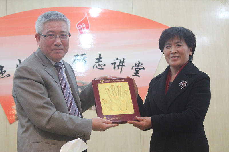 演讲结束后,黄桂友专门录制了对母校校庆的祝福微视频,并郑重留下自己的手模,副校长康淑敏代表学校为其颁赠“杰出校友母校演讲纪念”纪念牌以及尼山石名章纪念品。