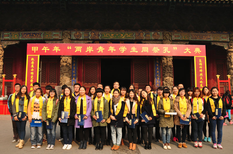 上午十时许,台湾高校师生代表与我校师生代表近百人来到孔庙大成殿朝圣谒孔,省台办相关负责人、我校副校长康淑敏出席仪式。在平和中正的雅乐和氤氲香火中,参祭师生怀着庄严、崇敬的心情沿神道缓缓步入孔庙,来到大成殿前。主持人宣布祭孔大典开始。礼仪人员向孔子像献上圣土圣水,参祭师生先后敬献了花篮。康淑敏诵读了祭文,文中表达了对两岸青年携手承延圣哲精神,承续民族根脉,共建和谐社会、幸福家园的美好希望与祝福。在舞乐和钟鼓声中,两岸青年学生齐诵《论语》经典篇章,以此向这位万世师表致礼。诵读完毕后,全体参祭师生整冠肃立,向至圣先师行三鞠躬礼,表达对这位先贤的缅怀和深深敬意。