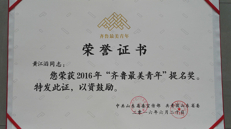 黄江滔同志获山东省“齐鲁最美青年”提名奖