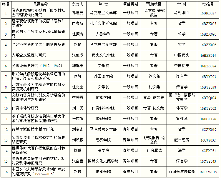 2016年国家社科基金项目公布 我校全省排名第二